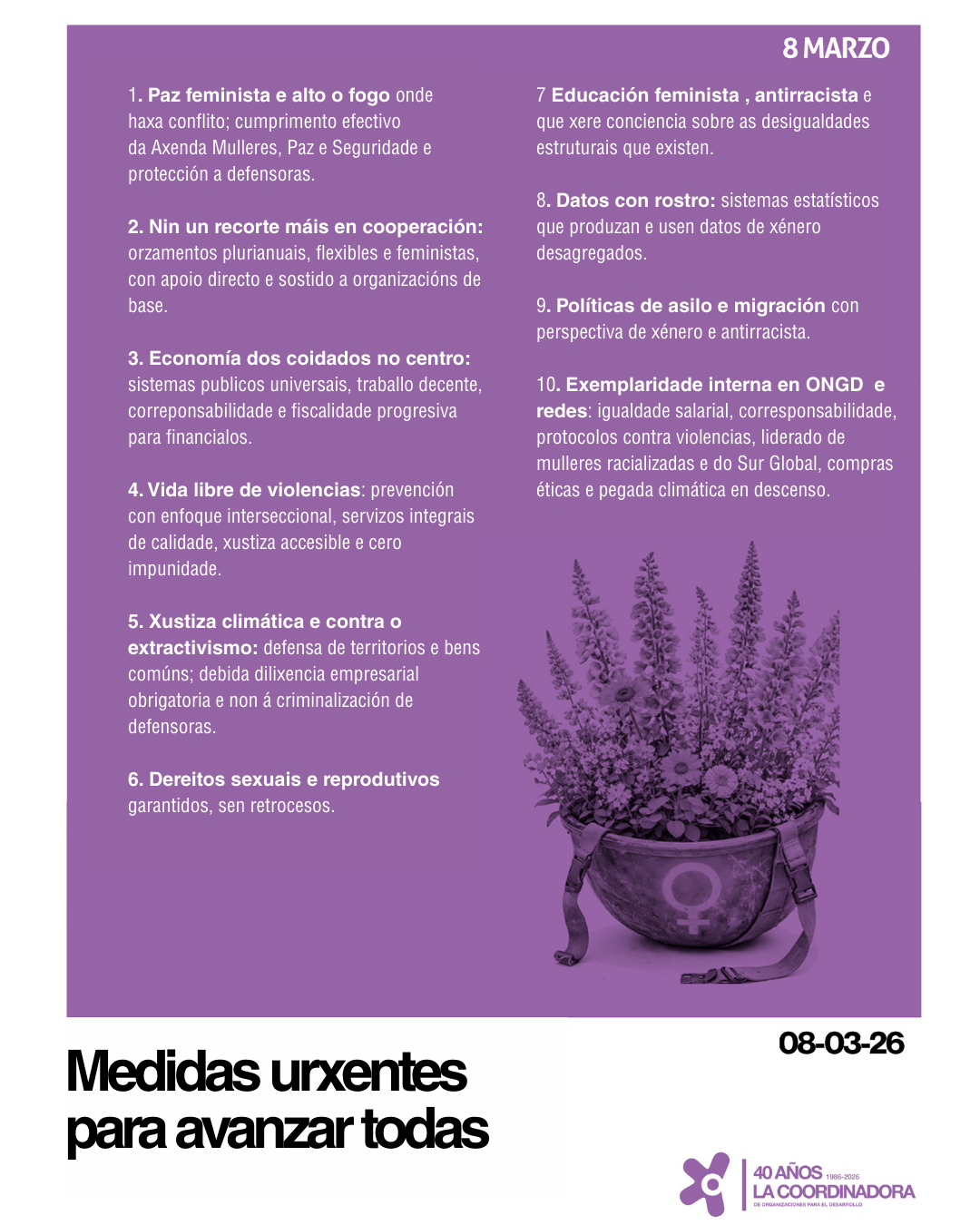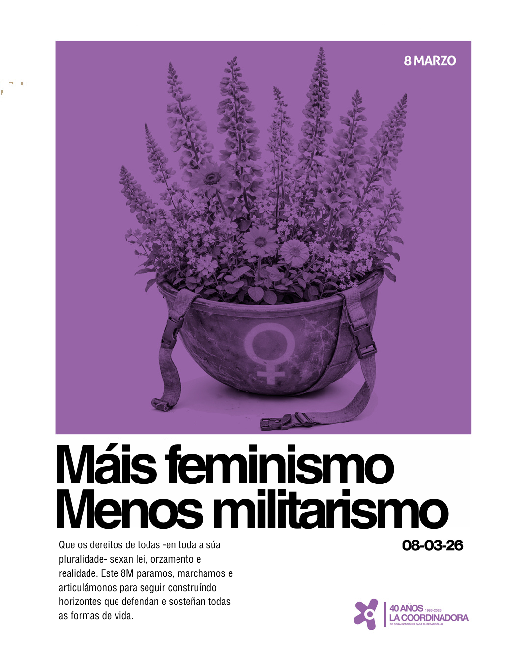 Nun tempo de deterioro democrático e multilateral, con guerras e ocupacións -moitas delas de carácter xenocida-, supremacismos, autoritarismos e un capitalismo extractivista que ameaza a vida humana e non humana, queremos reafirmar o noso compromiso de defender, artellar e soster todas as formas de vida.