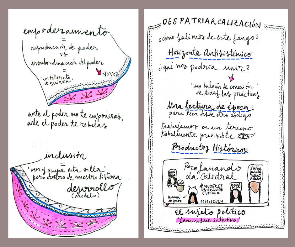 Unha das preto de cincuenta persoas que asistiu ao encontro con María Galindo foi a artista Adela Vázquez, que compartiu connosco os seus apuntes, en forma de relatograma.